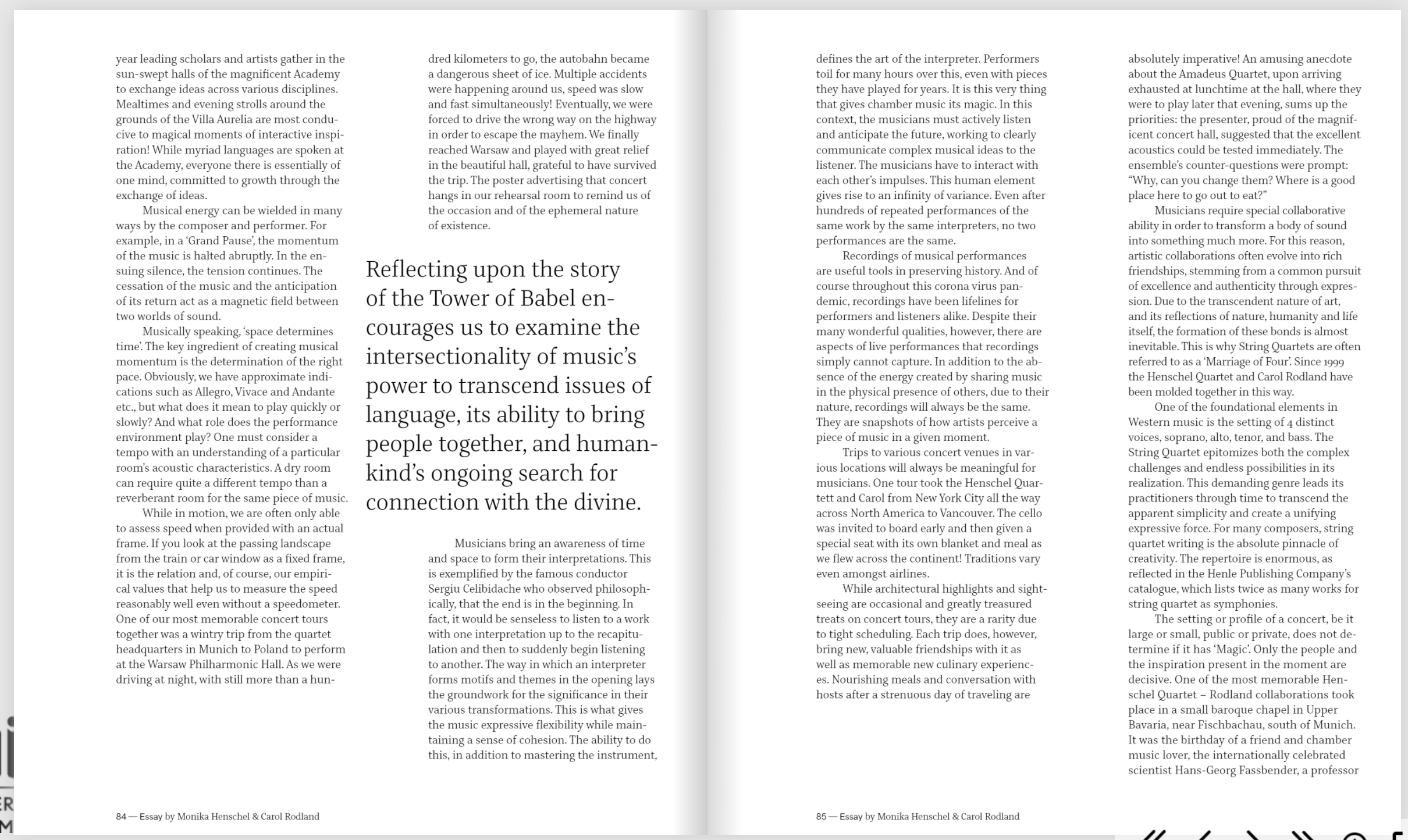 Monika Henschel wurde gebeten, ein Essay zum Thema des diesjährigen TAD „Reimagine the tower of Babel“ beizutragen. Zusammen mit ihrer Kollegin Prof. Carol Rodland von der Juilliard School in New York entstand eine Reflektion über verschiedene Phänomene der Musik im Kontext zwei Jahrzehnte gemeinsamer Konzertreisen.